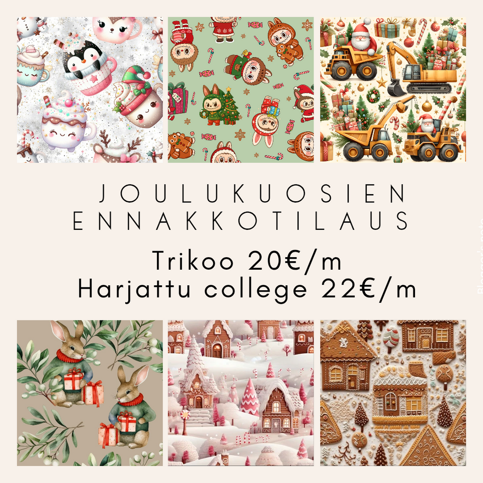 Ihanat kuosit joulun fiilistelyyn ja viettoon pehmeänä ja joustavana trikoona sekä lämpöisenä joustocollegena. Sopivat loistavasti joulupaitoihin, pyjamiin tai vaikka koko perheen yhteensopiviin asuihin.