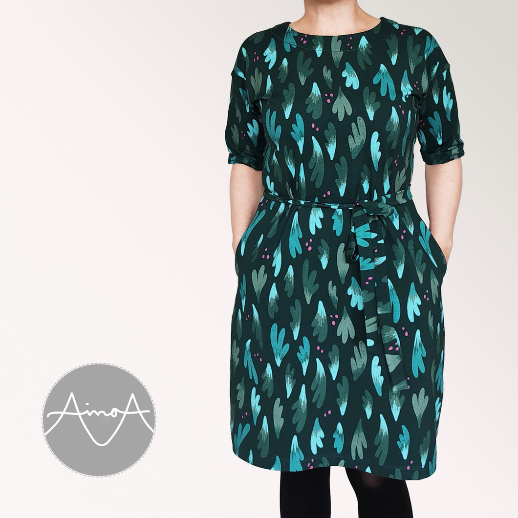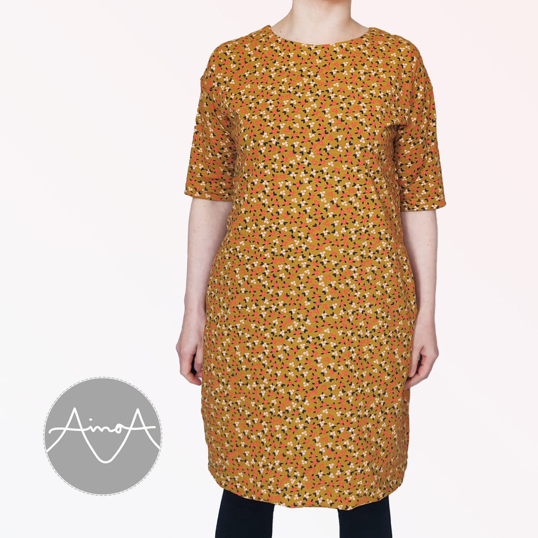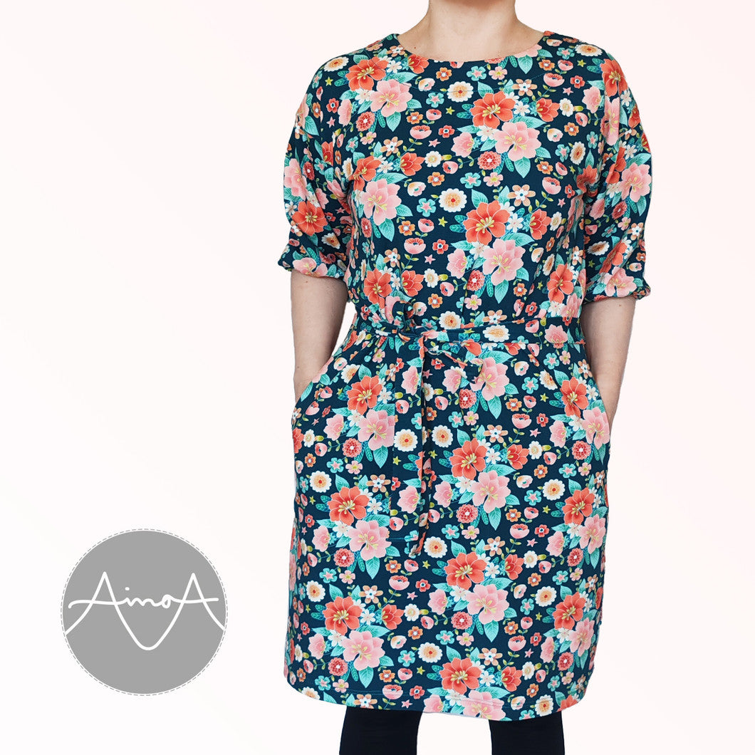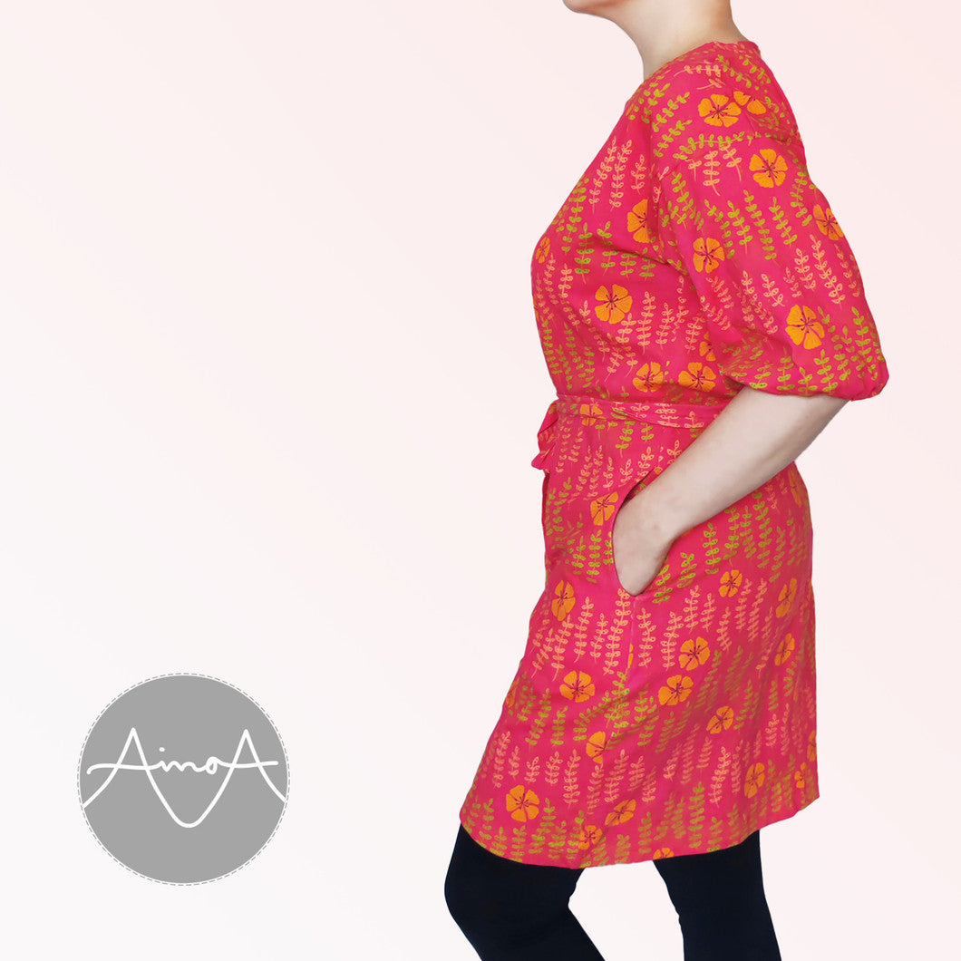 Mekko on malliltaan mukavan väljä mutta mekossa on silti muotoa antavat saumat. Mekon olan sauma on laskettu. Voit ommella mekon suoralla tai poimutetulla hihalla. Irrallisen vyön avulla voit säätää mekon vyötäröä itsellesi mieluisaksi. Mekon helma on noin polvimittainen. Helman sivusaumoissa on kätevän taskut.
