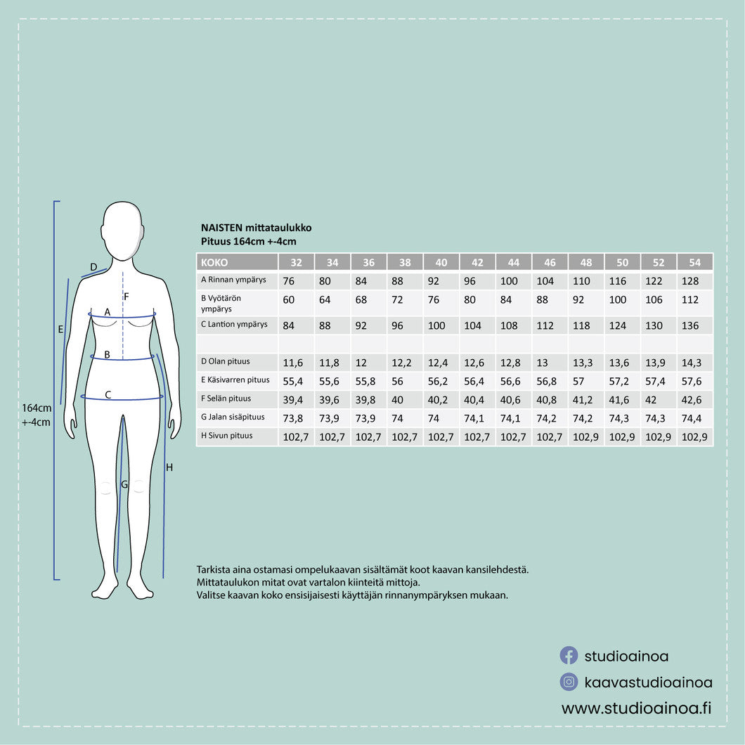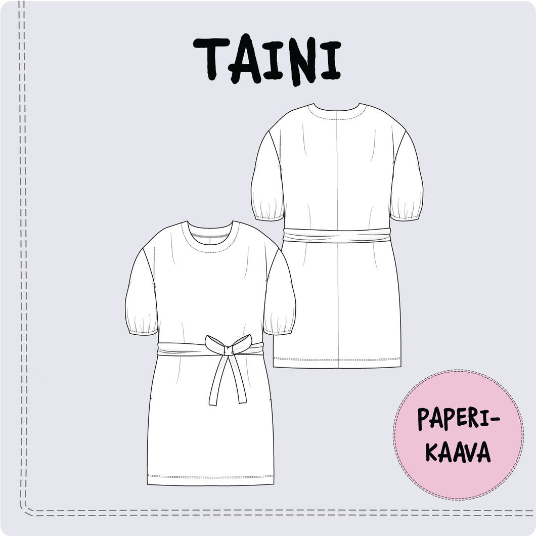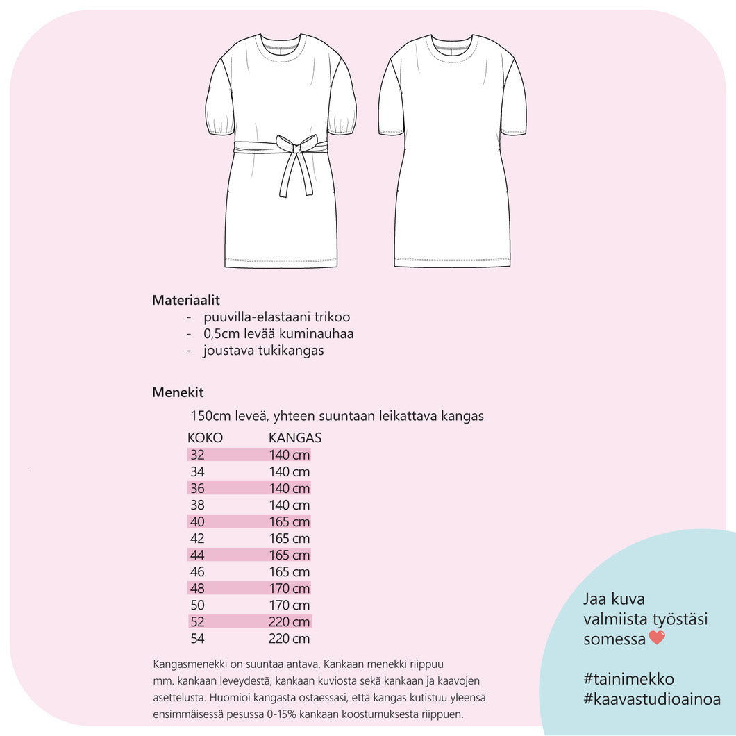Tämä kaava sisältää kaava-arkin ja suomenkieliset kuvalliset ohjeet käytännöllisen ja mukavan Taini-mekon ompeluun. Taini-ompelukaava on tarkoitettu joustavalle puuvilla-elastaani trikoolle.