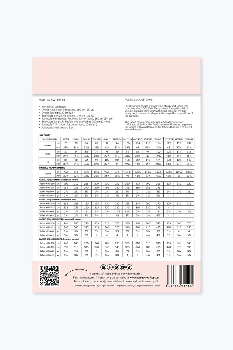 Kielo-mekko ja -haalari ovat ihanan rennot mutta silti tyylikkäät vaatteet! Molemmat versiot voi ommella joko hihoilla tai ilman. Mekkomallissa on pääntiekaitale sekä takahalkio helmassa liikkumavaraa lisäämässä. Hihattoman mekon kädentiet on viimeistelty vinokaitteella. Haalarimallissa on takana halkio nappikiinnityksellä, ja sen pääntie on viimeistelty erillisellä pääntien vastakappaleella.